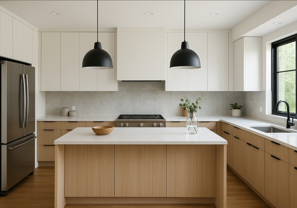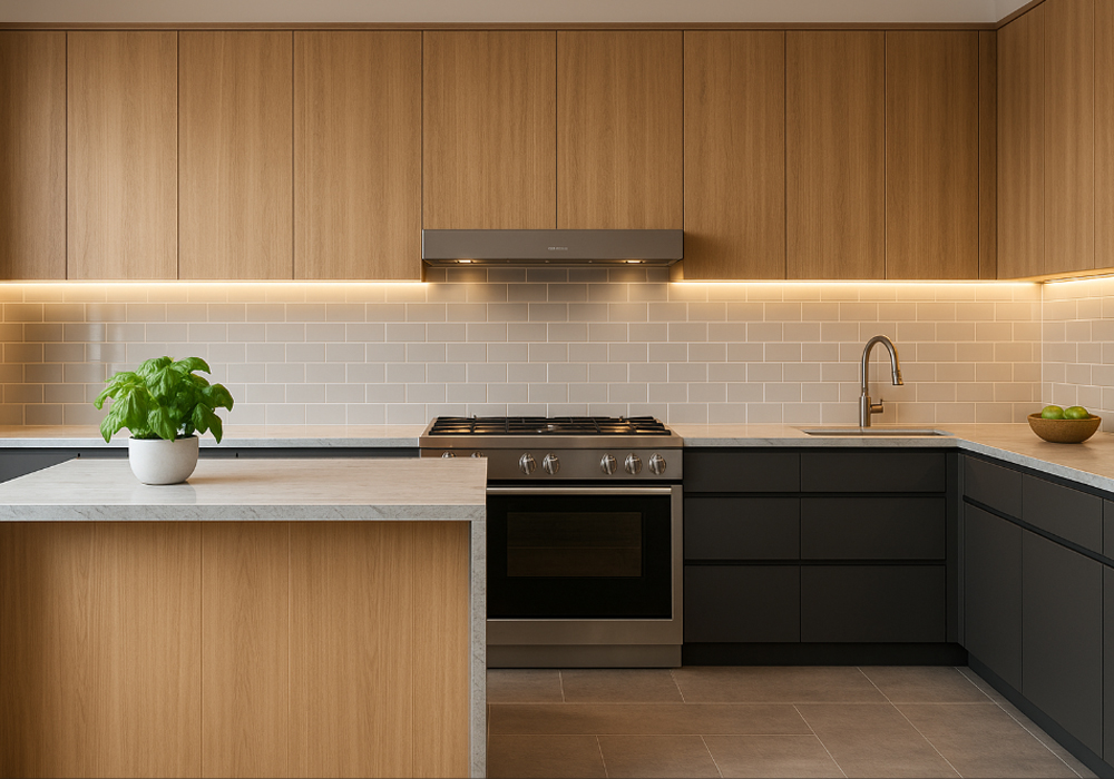 Ánh sáng: nên có sự khác biệt nhẹ giữa khu Hỏa (bếp) và khu Thủy (rửa) – ánh sáng vàng ấm ở bếp, ánh sáng trung tính ở bồn rửa.