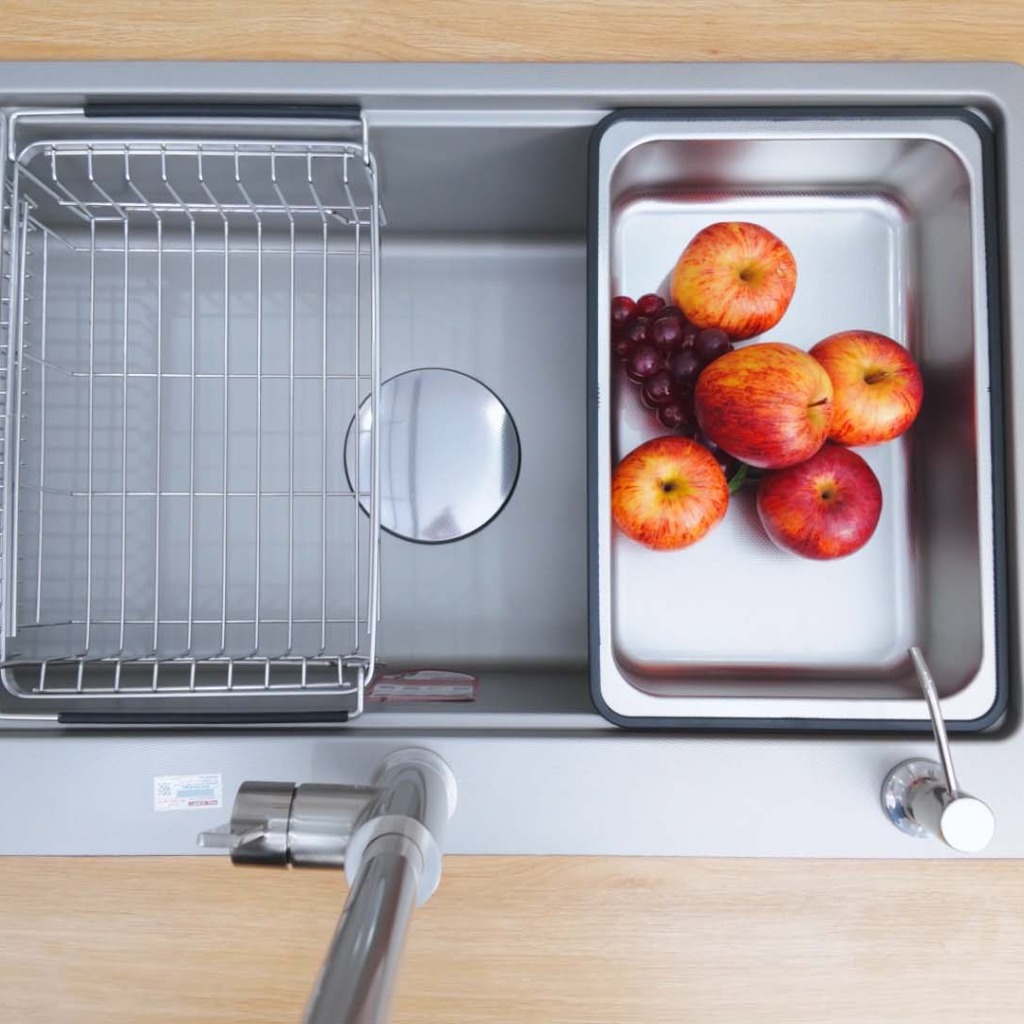 Phụ kiện đi kèm: xi phông, chậu rửa inox 304, 2 rổ inox