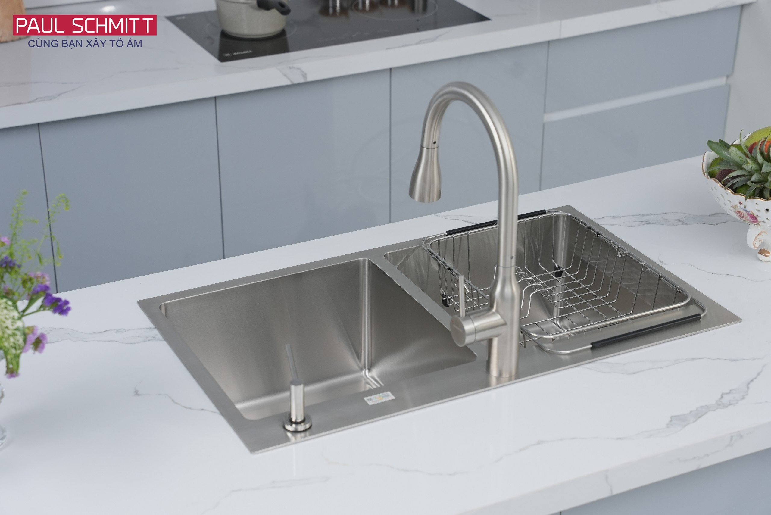 Chậu rửa bát 1 hố Paul Schmitt PAM8048-TE với thiết kế thêm 1 chậu nhỏ giúp các bà nội trợ có thể để rau củ quả hay bát đũa rửa xong vào chậu đó sẽ giúp cho việc làm bếp trở nên thuận tiện hơn rất nhiều.