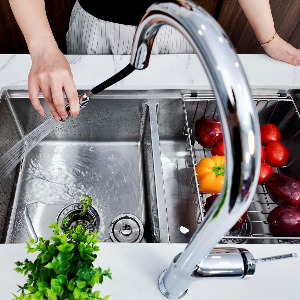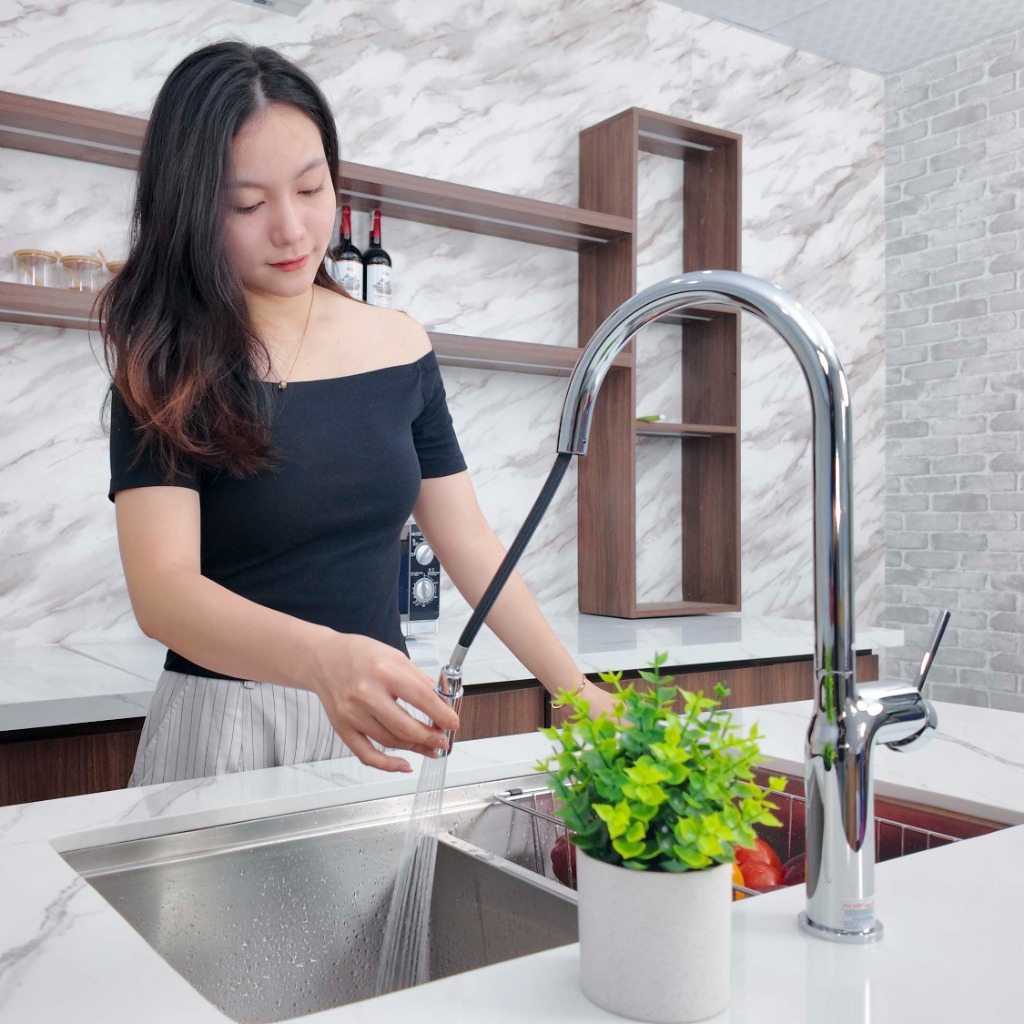 Vòi rửa bát nóng lạnh cho phép điều chỉnh nhiệt độ nước một cách linh hoạt, phù hợp với mọi nhu cầu sử dụng: từ rửa rau củ bằng nước ấm đến vệ sinh bát đĩa hiệu quả với nước nóng.