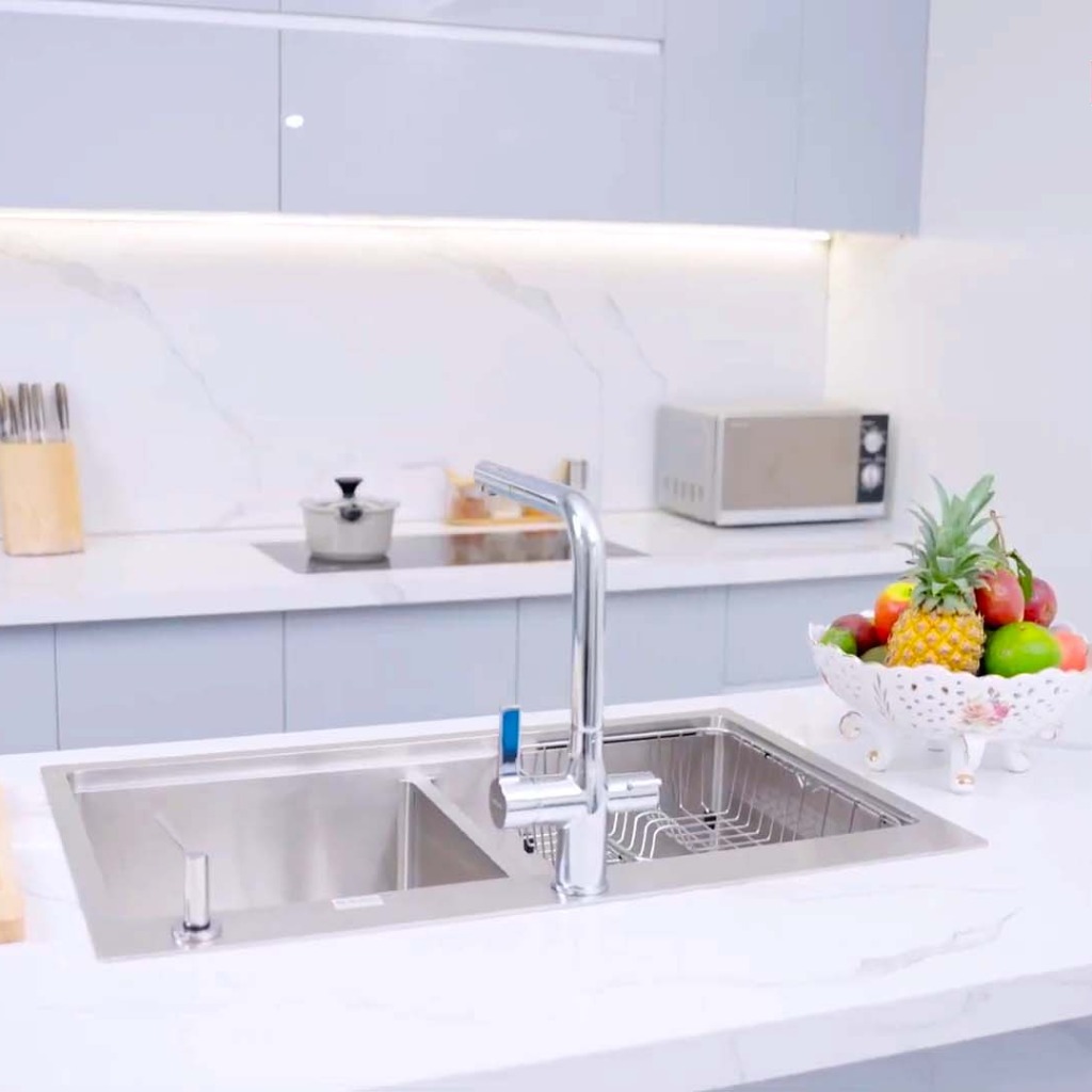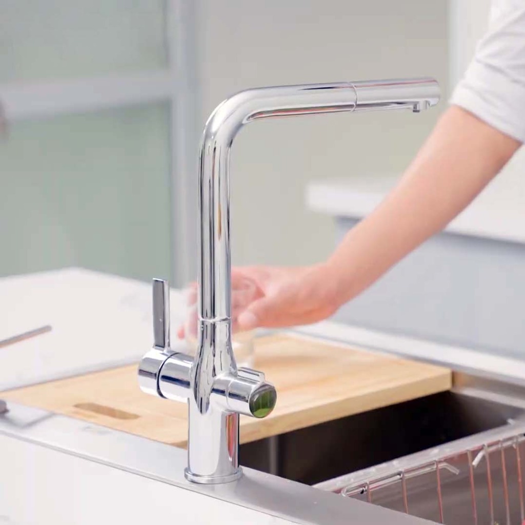 Cả hai được dẫn qua hai cơ chế điều khiển độc lập trên cùng một thân vòi – giúp người dùng dễ dàng lựa chọn loại nước phù hợp, không cần khoan thêm lỗ hoặc lắp thêm vòi RO riêng.