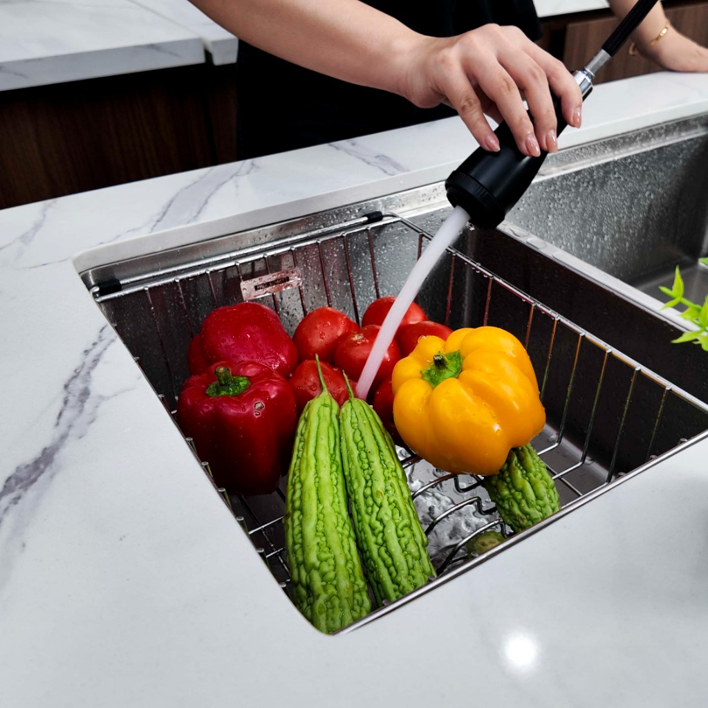 Dòng nước mịn, nhẹ nhàng và lan tỏa rộng, lý tưởng để làm sạch rau củ và thực phẩm mềm mà không gây tổn hại.